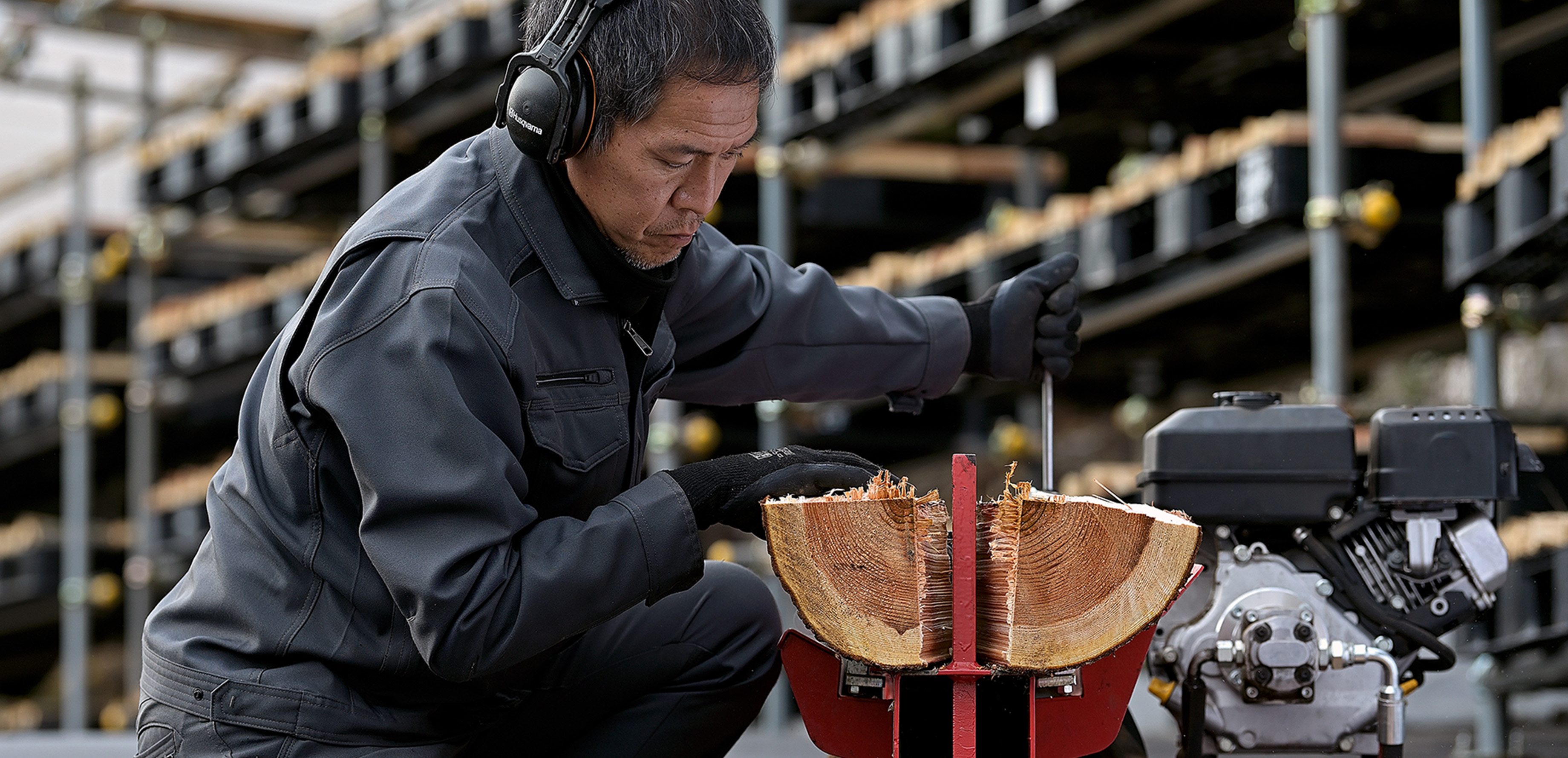 切った丸太を薪割り機で、
